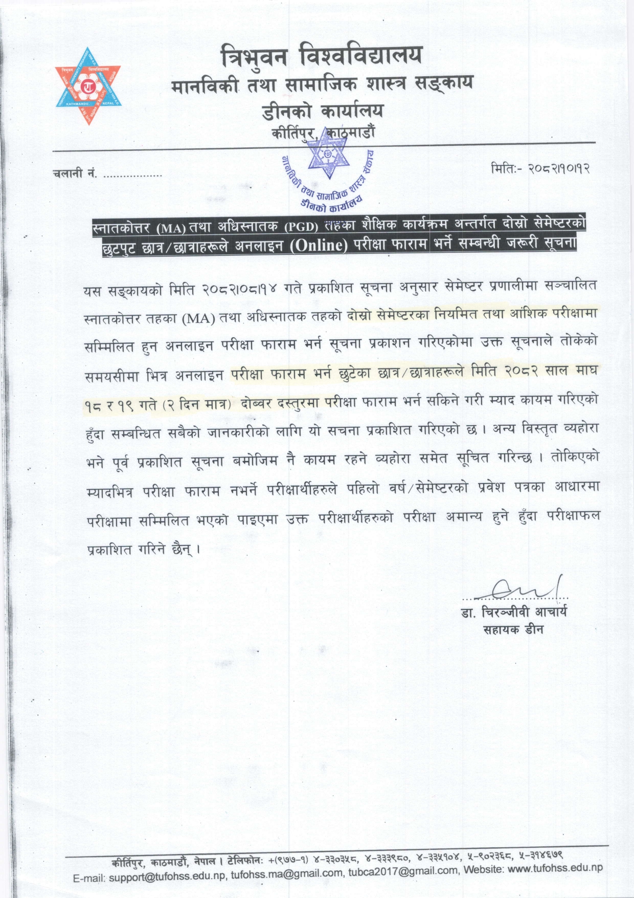 MA दोस्रो सेमेस्टरको परीक्षा फाराम भर्ने म्याद थप सम्बन्धमा ।
