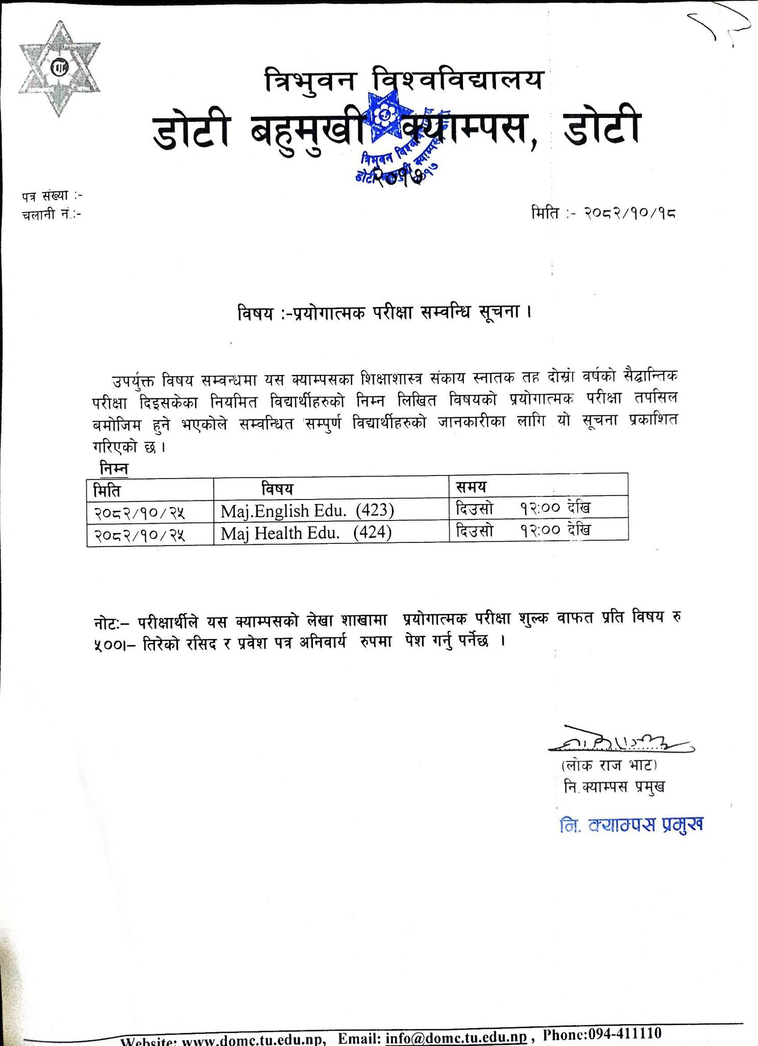 प्रयोगात्मक परीक्षा सम्वन्धी सूचना