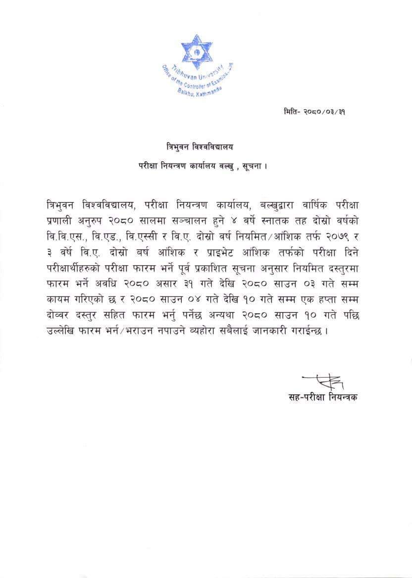 स्नातक तह दाेस्रो वर्षकाे परीक्षा फाराम भर्ने म्याद थप सम्वन्धी सूचना