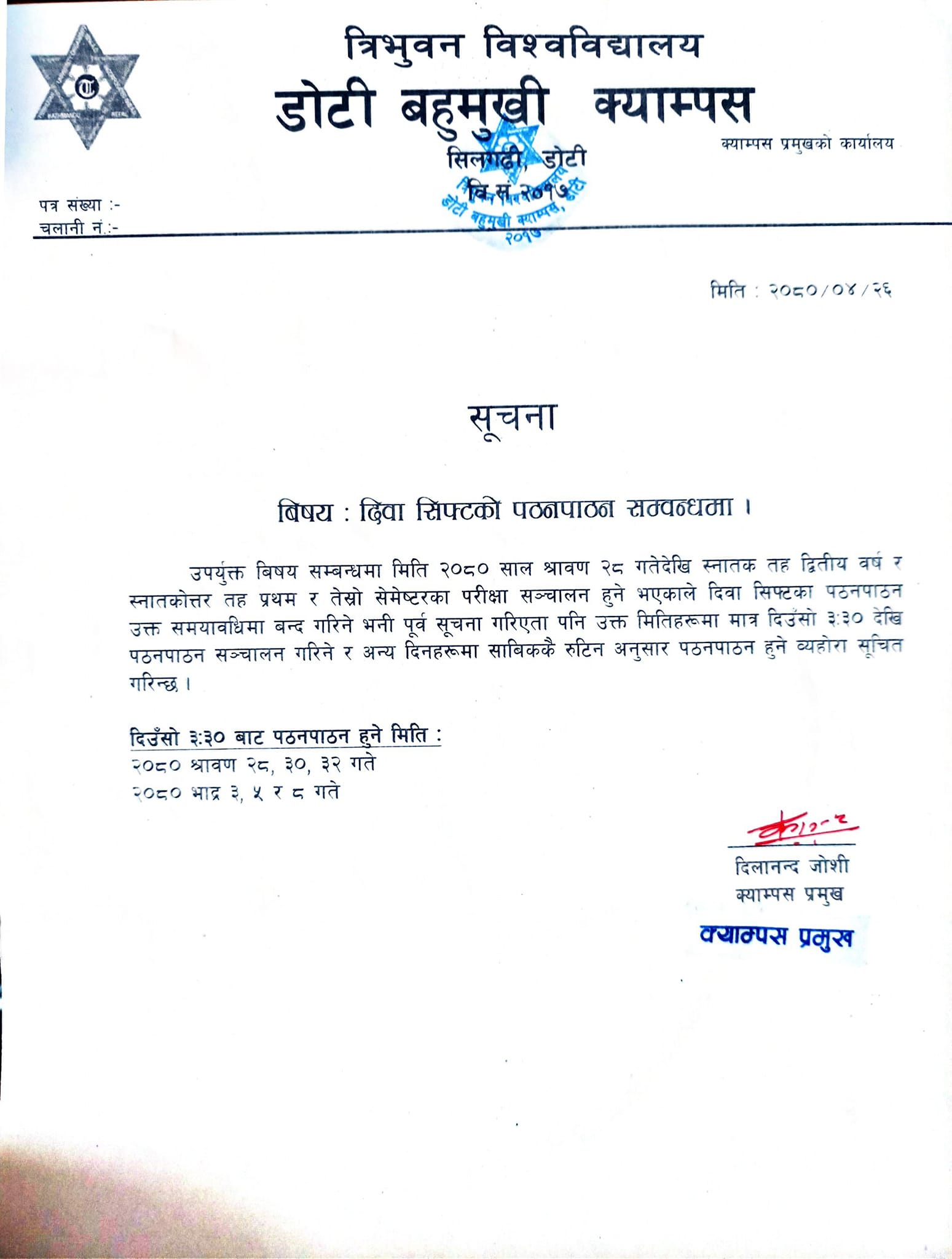 दिवा सिफ्ट पठनपाठन सम्वन्धमा