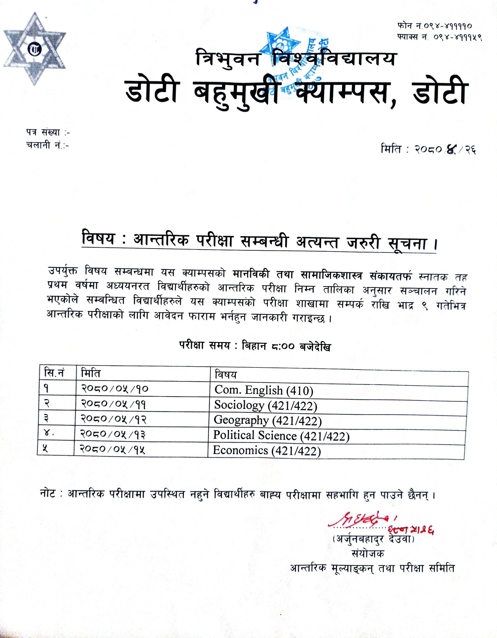 आन्तरिक परीक्षा सम्वन्धी सूचना