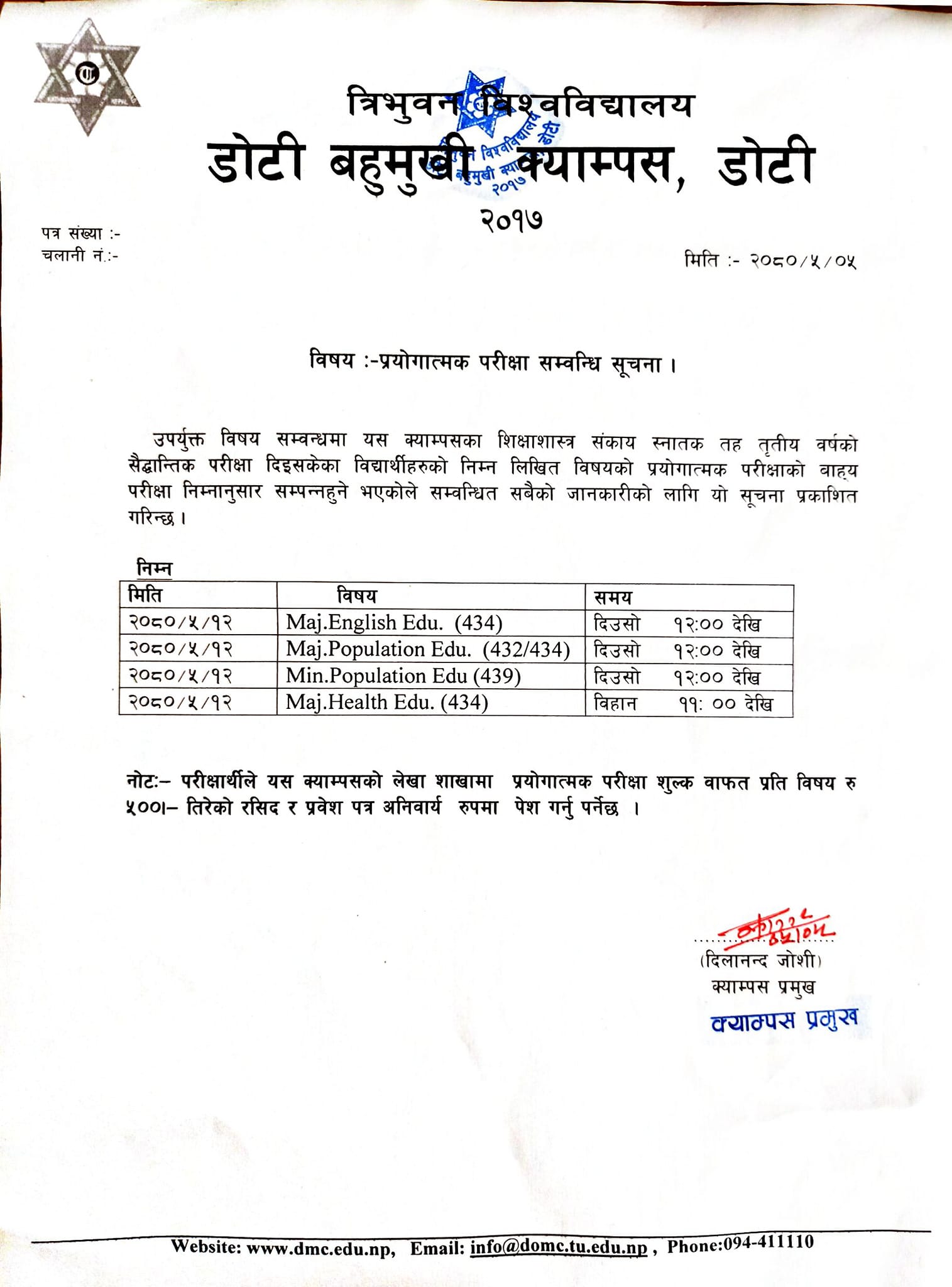 प्रयाेगात्मक परीक्षा सम्वन्धी सूचना