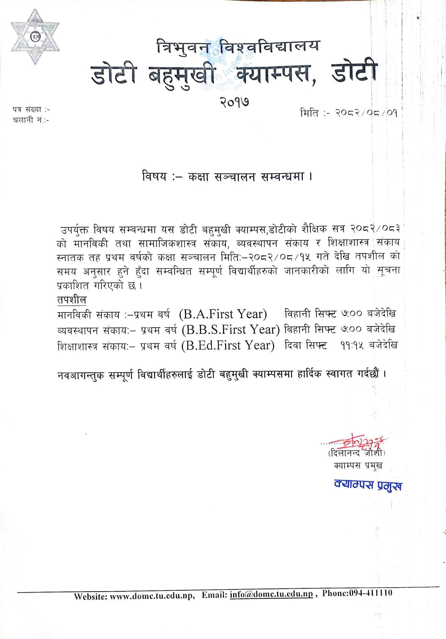 कक्षा सञ्चालन सम्वन्धी सूचना